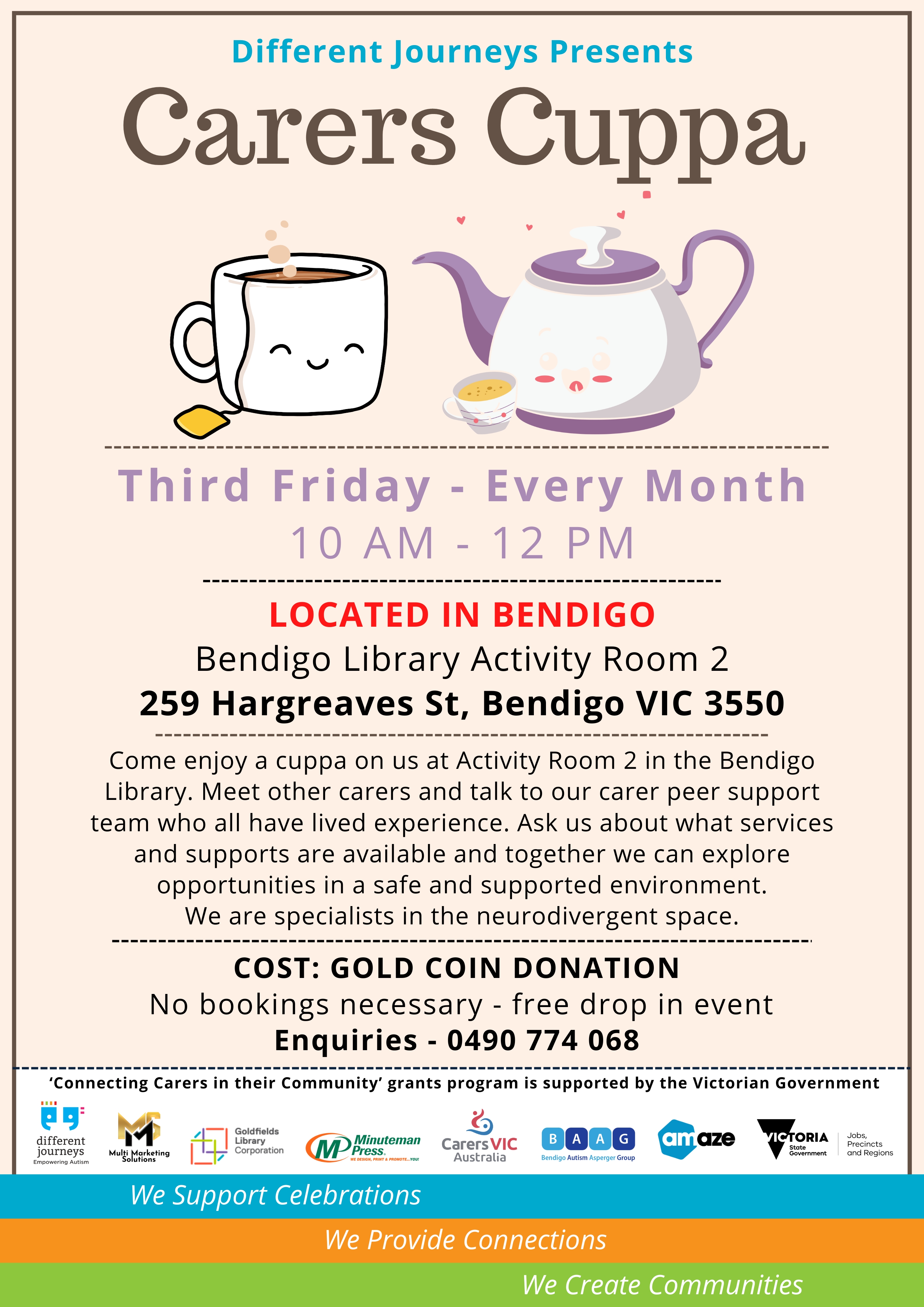 We are proudly supporting the informal coffee catch-up for those caring for an Autistic individual. It's an opportunity to come together no matter what the age of the person you are caring for. It's led by peer mentors with lived experience. Coffee is on us! Bookings are not required.